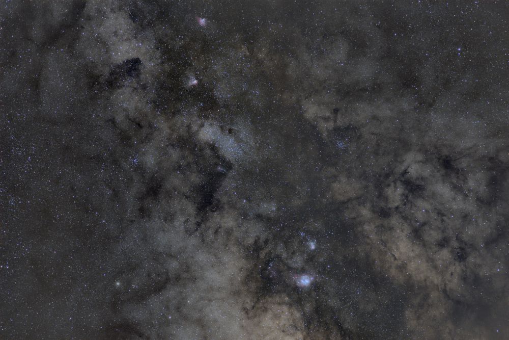 The Milky Way region in Scutum and Sagittarius around M8, M16, M17, M20, M21, M22, M23, M24, and M25. Captured with Canon 24-105@4 (F=105mm) on a Canon 6D camera on August 17, 2017, using a SW Star Adventurer astrotracker. SKAC KFU (SAO, North Caucasus). Exposure: 12 frames of 300 seconds each. ISO 1600, with darks and flats.
