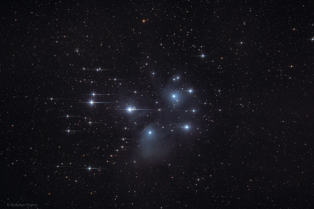 PLEIADES M45 Telescope/Lens: Astel 102mn Camera: Nikon d800 Mount: Celestron sgt5 Software: Seq/ph Ekaterinburg, Russia Light Pollution: Yellow zone Exposure: 30 x 90" ISO/Gain: 2000 Original size: https://deepskyhosting.com/RdqjtoZ Author: Evgeniy