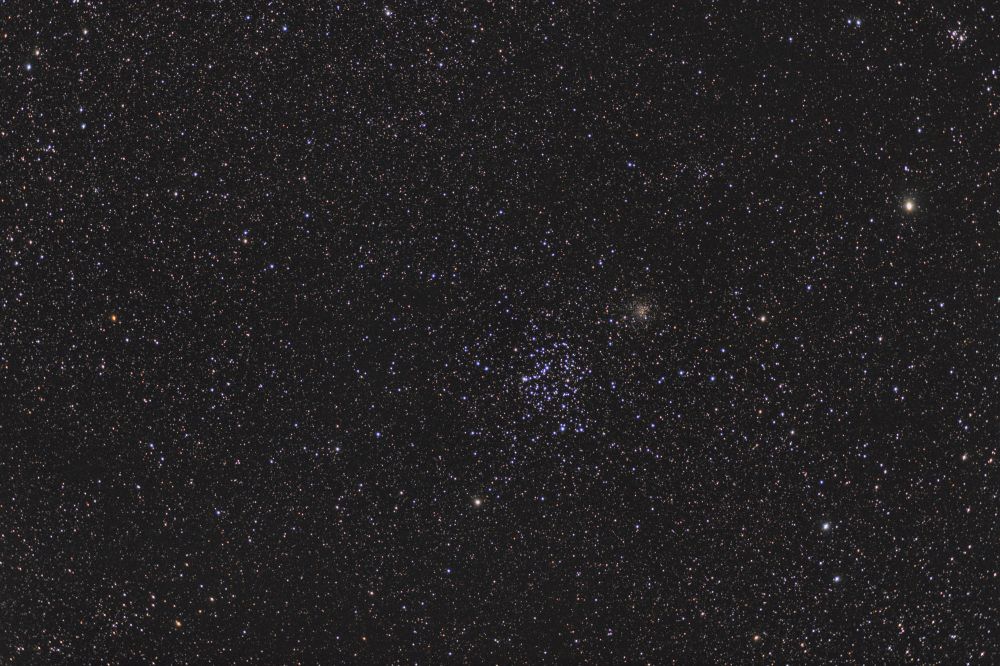Open clusters M35 (5.10m, 28.0′) and NGC 2158 (8.4m, 7.0′) in Gemini are winter sky gems. M35 is clearly visible through binoculars.