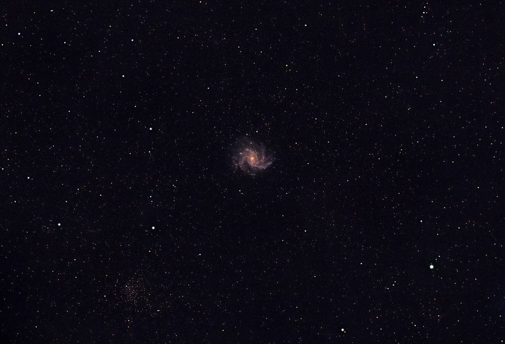 The Fireworks Galaxy (NGC 6946) is located 22 million light-years away and has a diameter of about 40,000 light-years. Its angular size is 11.5' x 9.5'.