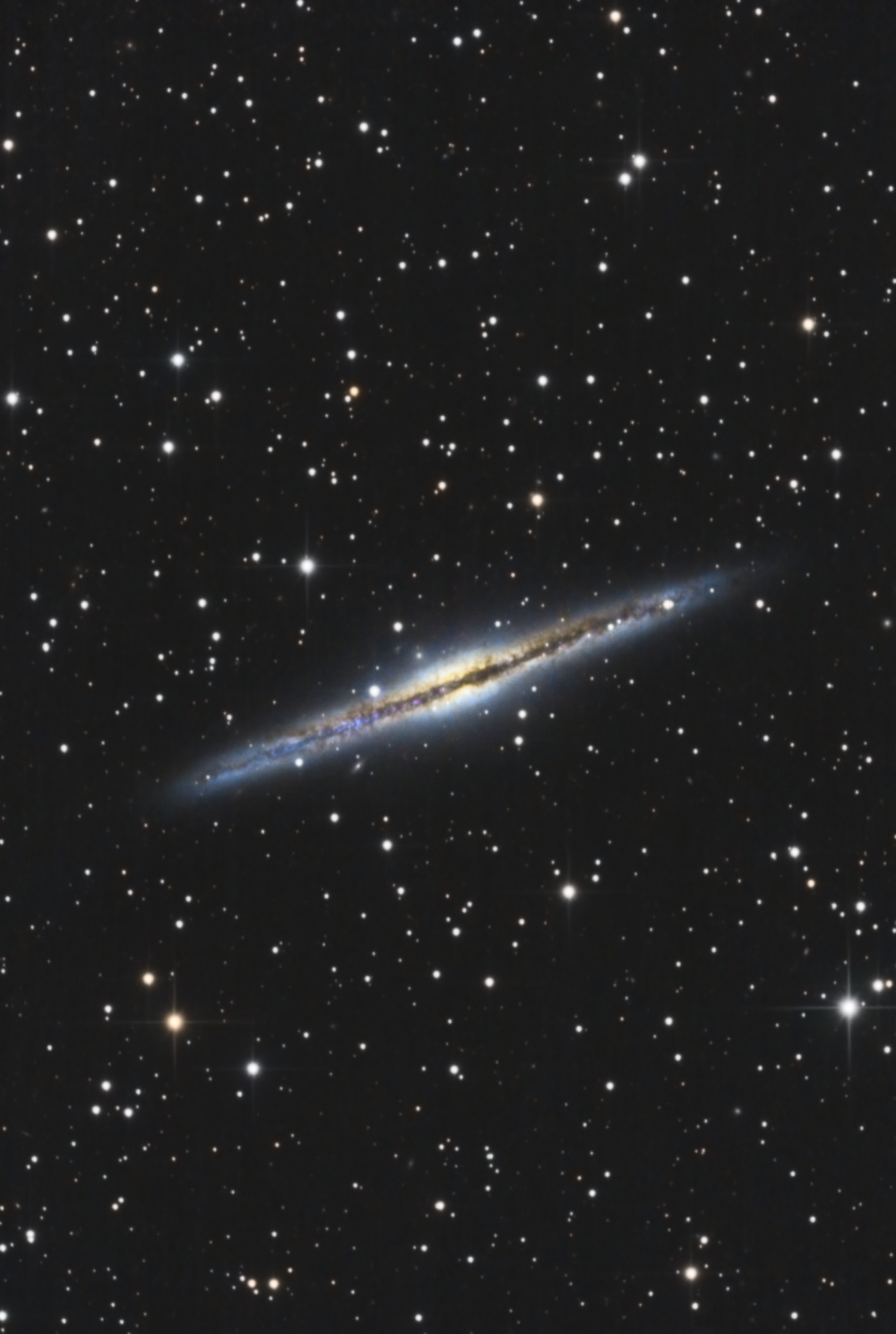 NGC 891 "SILVER SLIVER" Telescope/Lens: Sky-Watcher 200/1000PDS Camera: ZWO ASI 178 MC Mount: homemade harmonic mount Guide Scope: OAG Askar Guide Camera: 120mm zwo Software: siril, PS, asiair mini, dss, GraXp, Accessories: sharpstar 0.95 mpcc Elatma, Russia Light Pollution: Green zone Exposure: 150 x 120" ISO/Gain: 0 50 x 300" ISO/Gain: 0 Before you is the galaxy NGC 891 — one of the best examples of a spiral galaxy that we observe almost exactly edge-on. This perspective is a unique opportunity to study how our own galaxy is structured. Original size: https://deepskyhosting.com/TRKCQuS Author: poiskovik_RZN