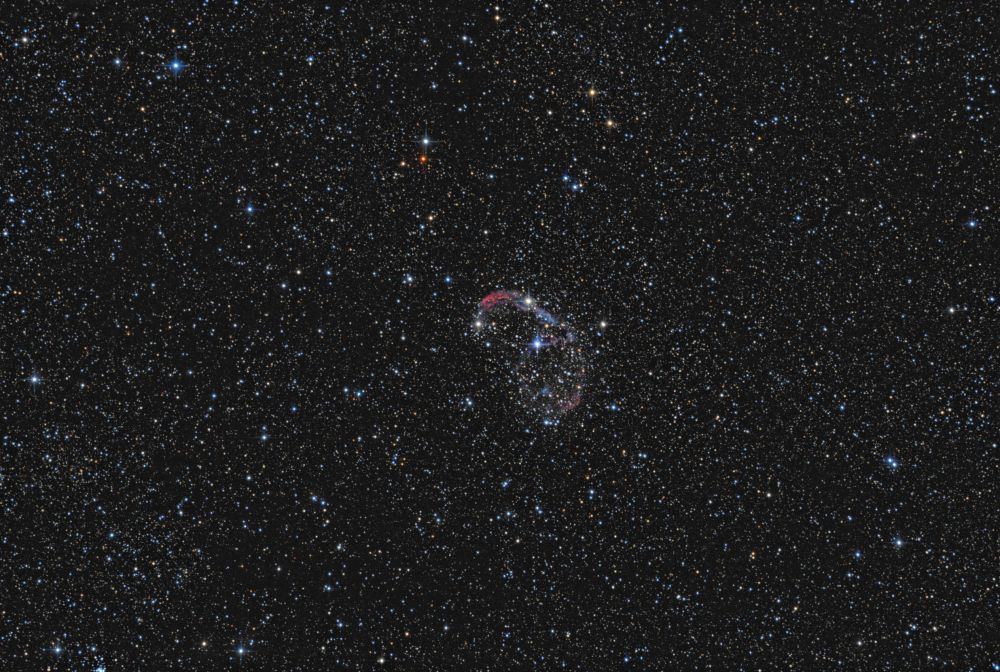 The Crescent Nebula is a diffuse emission nebula in the constellation Cygnus. This image is the result of four imaging sessions in the autumn of 2017. Captured from a balcony in Kharkiv, a red zone for light pollution.