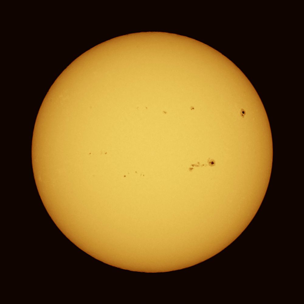 Sun on January 22, 2025 at 12:29 UTC+5. Loggia window. Svbony SV225 (AZ), Svbony SV503 102ED, film filter, Nikon D5100 - 1/320 sec, ISO 100. AutoStakkert - 10 out of 30k, Photoshop.