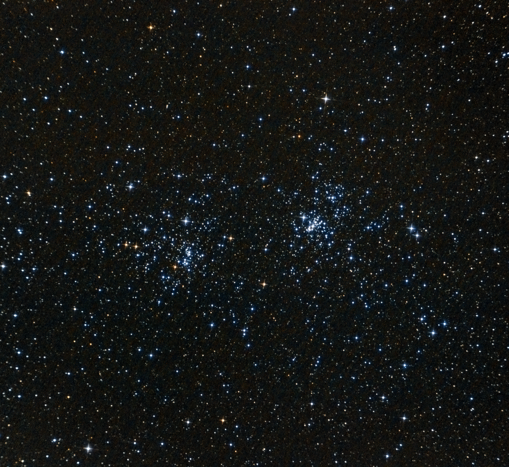 The Double Cluster in Perseus h+χ An open star cluster in the constellation Perseus, located about 7,500 light-years away from us. This pair is also widely known as a pair of galactic star clusters cataloged as NGC 869 and NGC 884. The distance between the clusters is only a few hundred light-years, and their age, determined from observations of individual stars, is nearly the same—around 12.8 million years.