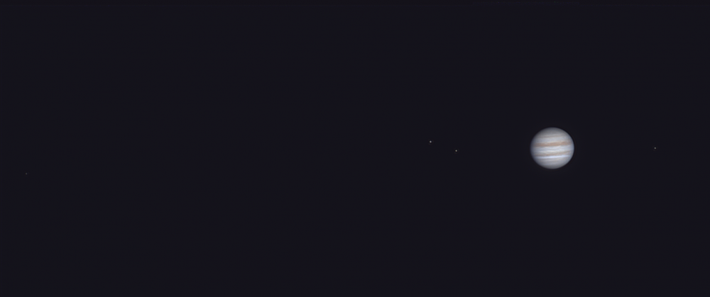 Jupiter and its satellites Callisto, Ganymede, Io, Europa (left to right)