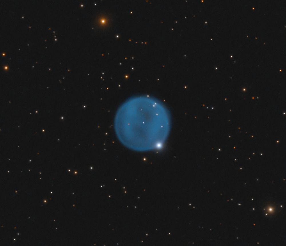 The Diamond Ring Nebula, Abell 33 (PNG 238.0 + 34.8, PK 238 + 34.1) is an attractive symmetrical planetary nebula in the constellation Hydra. It was called the “diamond ring nebula” because of the star 7m (HD 83535) shining on its outer ring. Abell 33 is located at a distance of about 2700 light years away and has a shape almost right from the geometric point of view of the ball. Its visibble diameter is about 4.5' and integral magnitude is about 12.9m.
