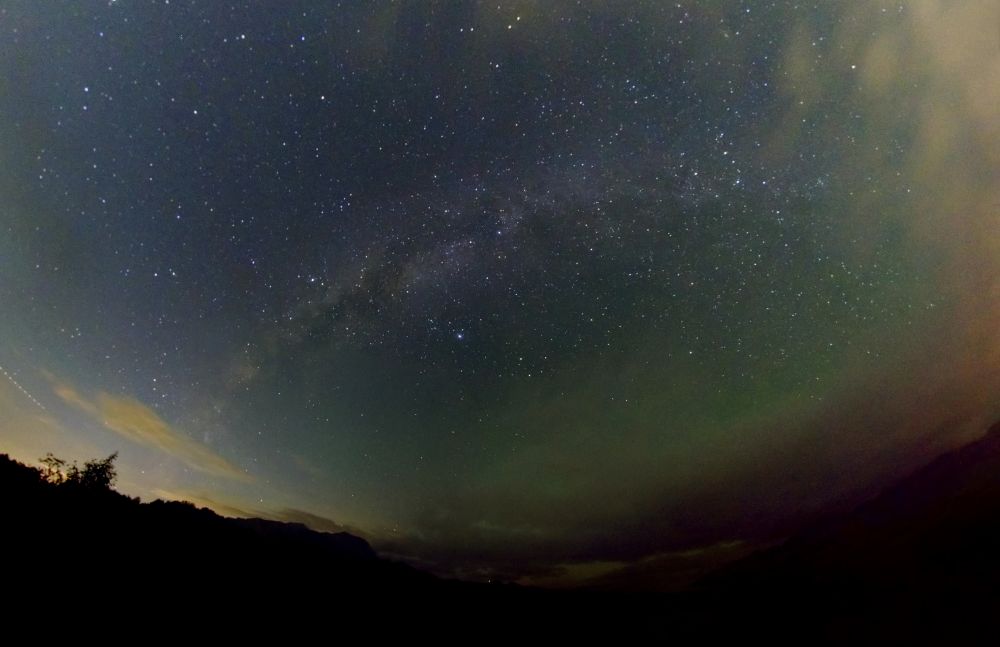MILKY WAY OVER THE ACHISHKHO AND CHUGUSH MOUNTAINS Telescope/Lens: Samyang AE 8mm 1:3.5 fish-eye CS Camera: Nikon D5100 Mount: Фотоштатив Software: PtGui, Photoshop Sochi Pgt Krasnaya Polyana, Russia Date and Location: