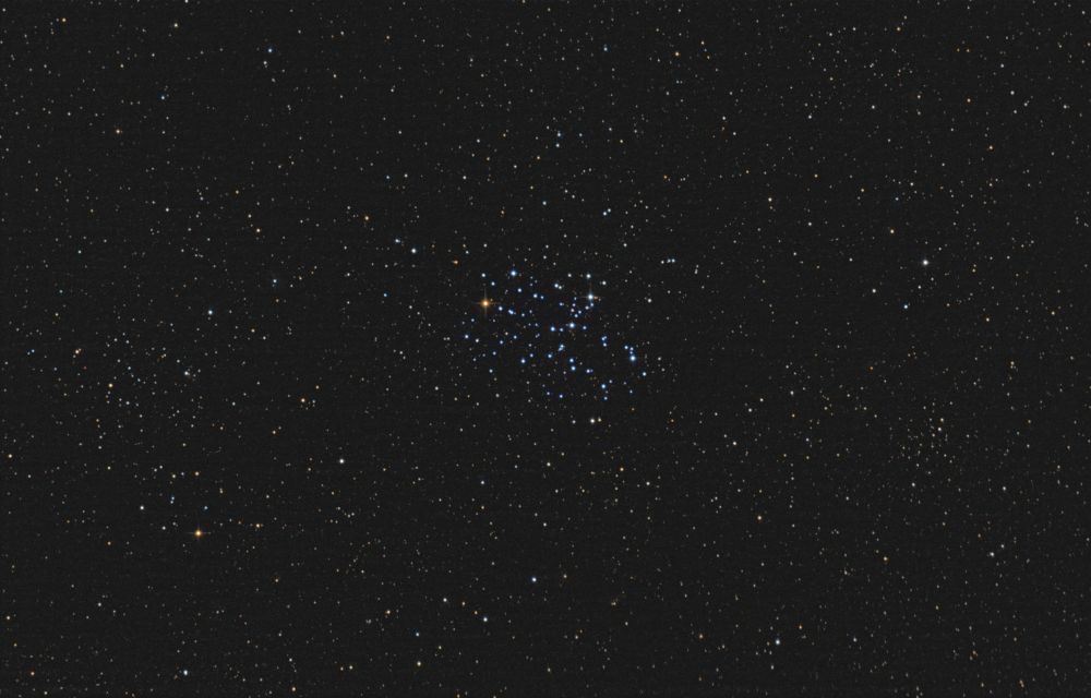 One of the southernmost objects in the Messier catalog is the open star cluster M6 in the constellation Scorpius. The cluster has its own name, "Butterfly," and indeed, the bluish stars of the cluster form a fairly recognizable pattern of this insect's wings and antennae. Due to its large negative declination (-32 degrees), M6 is poorly accessible for observation in the Northern Hemisphere—the object's altitude during imaging was only 6 degrees above the horizon. Balcony in Kharkiv, red zone of light pollution.