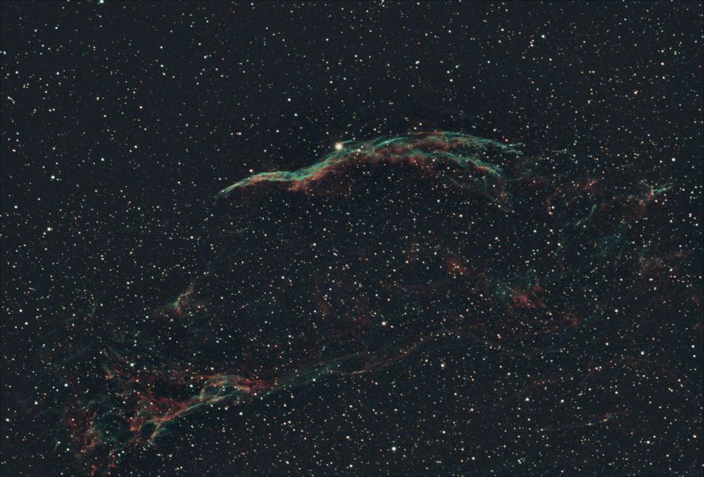 The emission nebulae NGC 6960 Witch's Broom and NGC 6979 in the Cygnus Loop. Night of August 2 to 3, 2024. 4th-floor balcony. Light pollution - Bortle 8. Celestron Advanced GT, Svbony SV503 80ED, SV193 0.8x, SV220 7nm Ha OIII, SV405CC. Acquisition: SharpCap - 15x180s. Guiding: SV106 60/240 mm, SV305M Pro - PHD2. DeepSkyStacker, FitsWork, Photoshop.
