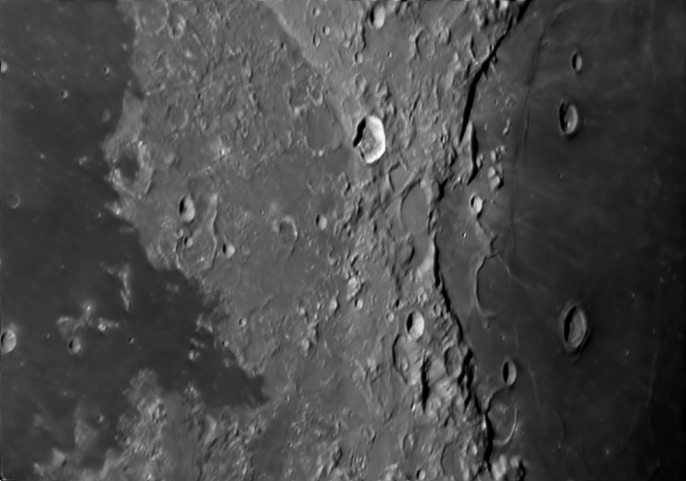 The area around the crater Proclus, located on the isthmus between the Sea of Crises and the Sea of Tranquility, is interesting because under certain lighting conditions, two mountain ridges in the Proclus R 1 region appear to connect, forming a "bridge." This was first noticed in 1954 when the May issue of *Sky & Telescope* magazine, published by Harvard University (USA), featured an article describing... a bridge photographed on the lunar surface, connecting two mountain ridges near the Sea of Crises. According to John O'Neill, science editor of the *New York Herald Tribune*, as well as English astronomers H.P. Wilkins and Patrick Moore, the photograph indeed showed a bridge, not a random rock formation merely resembling one. Wilkins calculated that this bridge was about 20 km long, and Polish journalist and researcher Robert Lesniakiewicz adds that it rose about 1,600 meters above the lunar surface and was about 3,200 meters wide. A truly cyclopean structure! But in reality, it's just a play of light and shadow :).