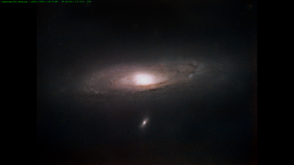 M31 WITHOUT STARS Telescope/Lens: Таир-3 Camera: Пансоник gx 80 Mount: Celestron NexStar SLT Software: DSS, Siril, Ps, starnet Berezniki, Russia Light Pollution: Yellow zone Exposure: 400 x 25" ISO/Gain: 3200 - без фильтра Captured over two nights at different locations. Heavy dew required frequent lens wiping. Original size: https://deepskyhosting.com/XAYjrF0 Author: Aleksandr-zvezdochet