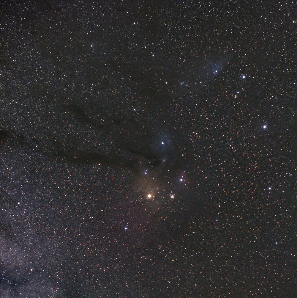 Multiple objects in a single frame: the Rho Ophiuchi molecular cloud, the Antares nebula and dark rivers, the globular cluster Crab, and the Blue Horsehead nebula.
