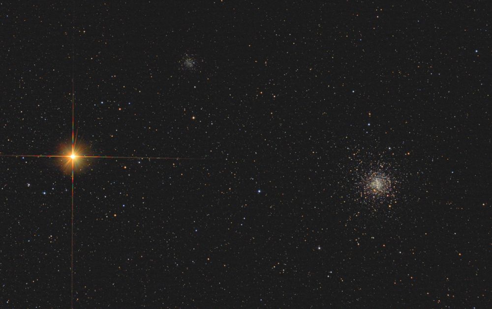 "The Jewels" of Scorpius. On the left is the constellation's main star—the red supergiant Antares. On the right is the closest large, bright globular cluster to Earth, the "Cat's Eye," also known as M4 in the Messier catalog. And above, slightly left of center, the smaller globular cluster NGC6144 "hides" in the frame. The objects were about 12 degrees above the horizon during the shoot. Taken from a high-rise balcony in a red zone of light pollution.