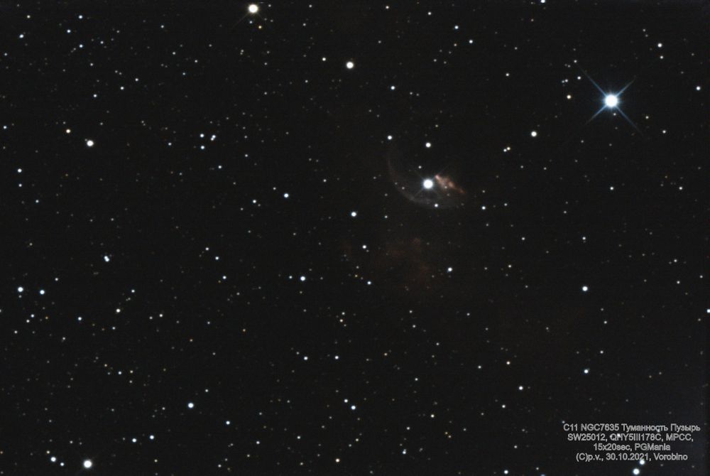 C11 NGC7635 Туманность Пузырь SW25012, QHY5III178C, MPCC, 15x15sec, PGMania (C)p.v., 30.10.2021, Vorobino Snapshot without post-processing. Alignment, calibration, median filter, and pyramid...