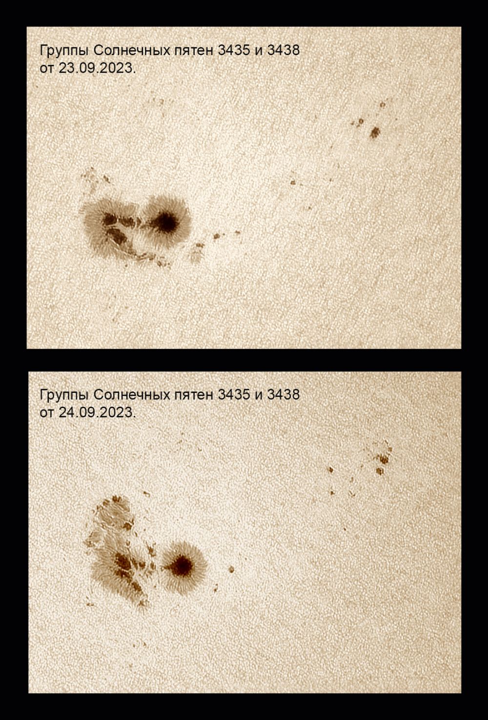 Changes in the appearance of sunspot groups over 24 hours Telescope: LX 85 M6 (D-150 mm, f-1800 mm). Mount: EQ-5 OnStep. Aperture filter with AstroSolar solar film. Camera: ZWO 290 MM, red filter Exposure: 1.45 ms, Gain: 0 (0%).