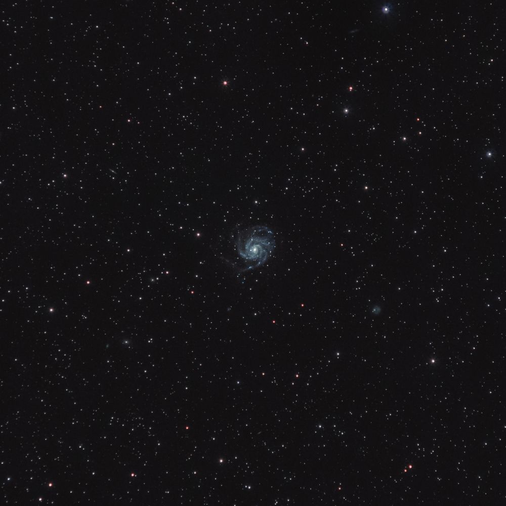 M101, the Pinwheel Galaxy. A spiral galaxy in the constellation Ursa Major. It is about 70% larger in size than the Milky Way. Discovered on March 27, 1781. Distance: 27 million light-years. Diameter: 170,000 light-years. Apparent dimensions: 27' × 26'. About 10 more galaxies can be found in the photo.