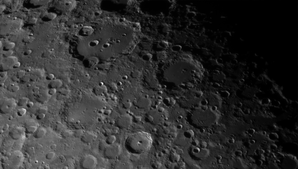 Moon, craters: Clavius, Longomontanus, Maginus, Wilhelm, Porter, Rutherford.