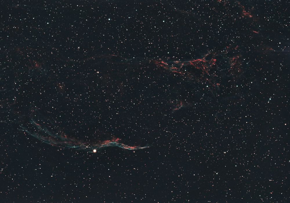 Emission nebulae NGC 6960 Western Veil (Witch's Broom) and NGC 6979 Pickering's Triangle in the sky of a million-plus city. These formations are parts of the large diffuse Veil Nebula (Cygnus Loop) in the constellation Cygnus. Captured on the night of September 8, 2024.