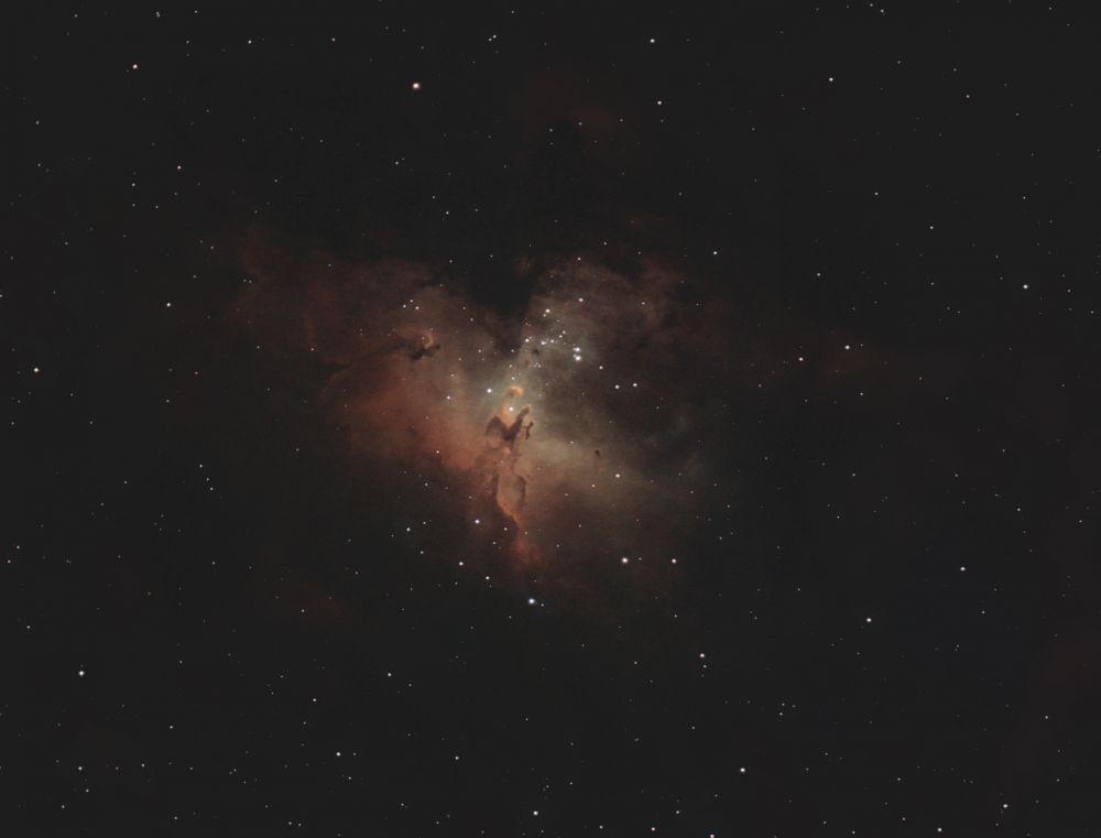 I wanted to photograph the M17 nebula, but I missed and aimed at the Eagle Nebula instead. In any case, I'm happy with the result. Full calibration (30 darks, biases, and flats).