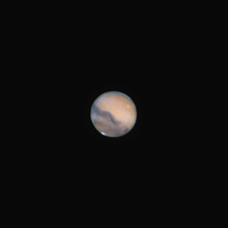 The 2020 opposition of Mars, on the night of October 13–14. The planet's distance was 62.7 million km, with an angular diameter of about 22.5 arcseconds. Note the Martian cloudiness in the twilight zones and over the north pole.