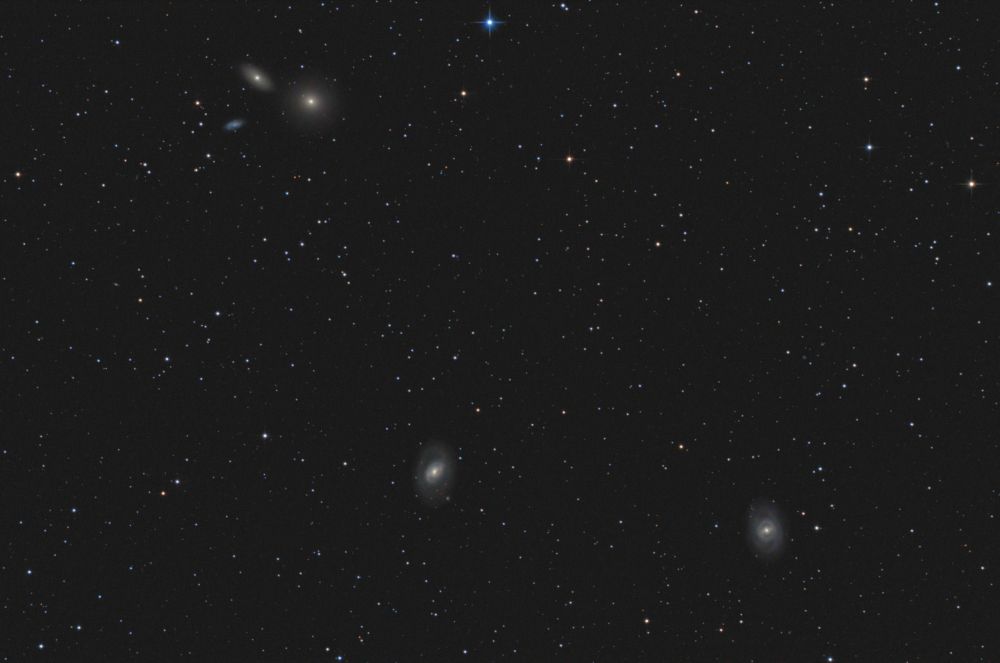 A galaxy group in the constellation Leo. From right to left are the spiral galaxies M95 and M96, above them the elliptical galaxies M105 and NGC3384, and slightly to the left another spiral galaxy, NGC3389.
