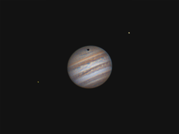 Jupiter and the shadow of Ganymede on May 20, 2017. Ganymede is on the right, Io on the left.