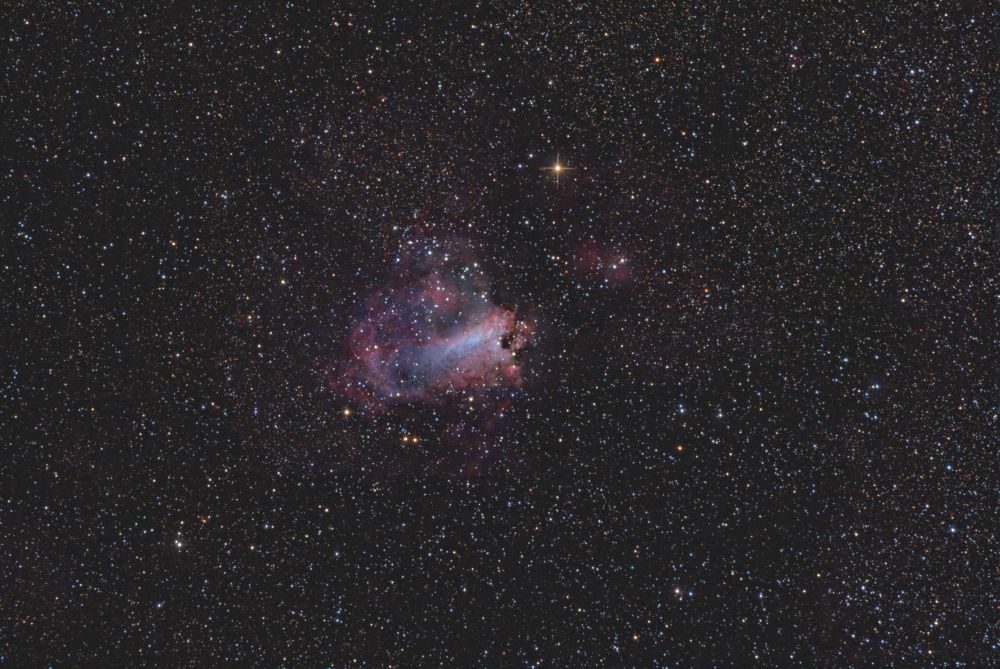 The Omega Nebula, also known as M17, is a diffuse emission nebula. It is located in the constellation Sagittarius. It has several other names: the Swan Nebula, the Horseshoe Nebula, and the Lobster Nebula. Taken from a balcony in Kharkiv, within a red zone of light pollution.