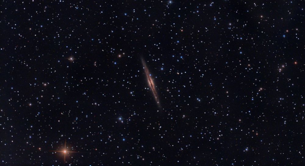 NGC 891 (also known as Caldwell 23, the Silver Sliver Galaxy, and the Outer Limits Galaxy) is an unbarred spiral galaxy seen edge-on, located about 30 million light-years away in the constellation Andromeda. - Wikipedia