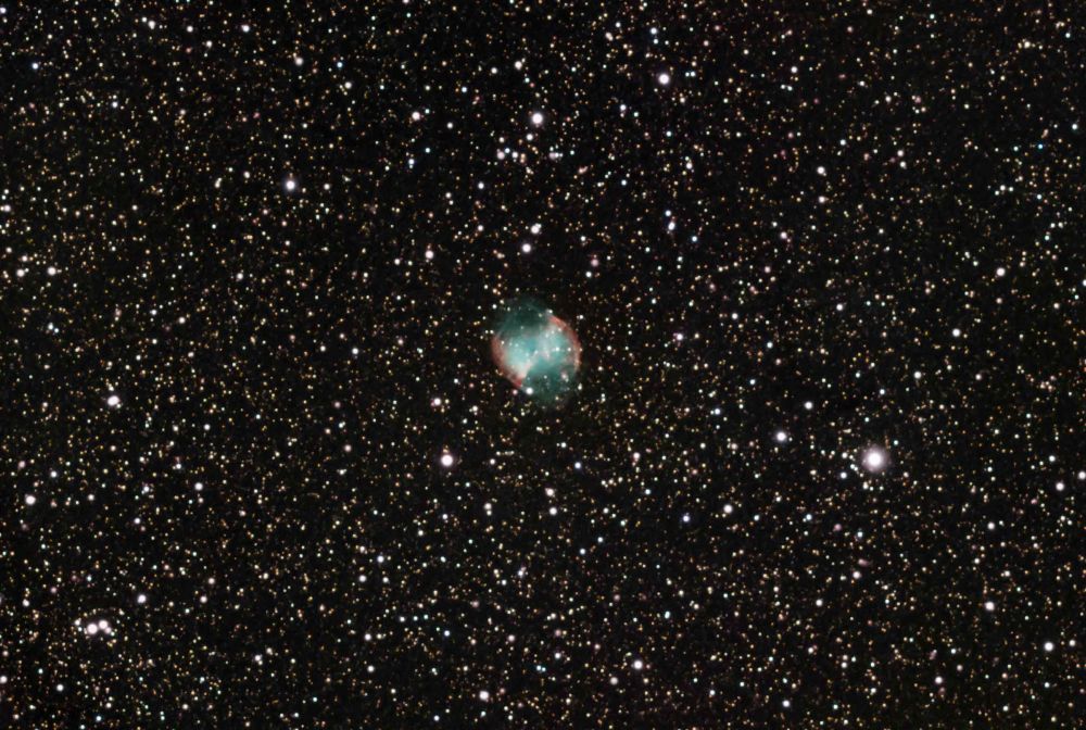 The Dumbbell Nebula M27 is one of the most famous planetary nebulae, located in the constellation Vulpecula at a distance of 1,250 light-years from Earth. It was discovered by astronomer Charles Messier in 1781 and is one of the youngest (3-4 thousand years) and brightest nebulae (+7.4 magnitude). It can be observed with 10x50 binoculars, but a telescope with an objective diameter of 80 mm or more is required for detailed study.
