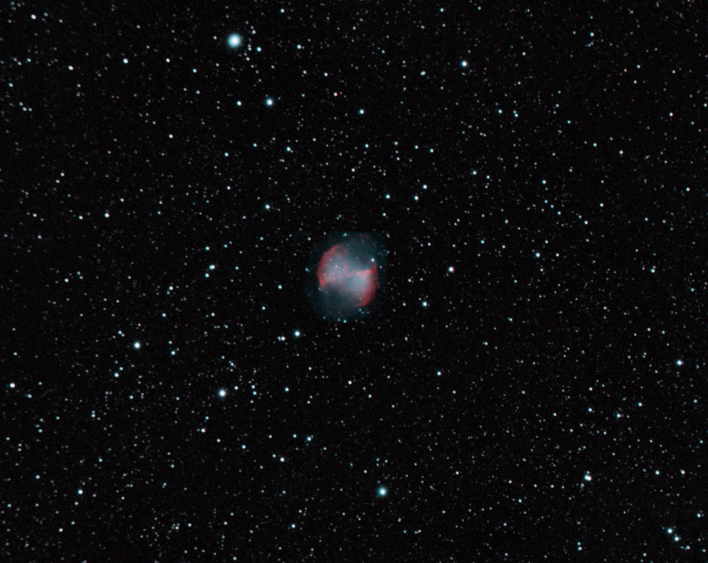 My first experience shooting a deep space object through narrowband filters on a monochrome camera. The shooting was done at a sensor temperature of 0°C. The color was formed according to the HOO (bicolor) mapping, added on top of the luminance channel, which was shot through a UV/IR cut filter. Unfortunately, the OIII filter produces large halos around stars, so they had to be removed in this color channel.