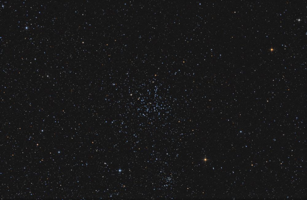 In the center is the large and bright M38, whose proper name is the Starfish Cluster (or Dinosaur Footprint). Below is the smaller and fainter NGC 1907.