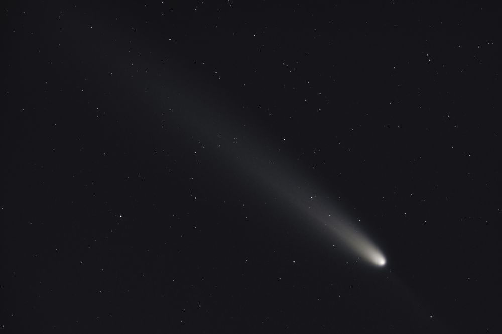 Comet C/2023 A3 (Tsuchinshan-ATLAS) on the evening of 10/18/2024. Area near the village of Baigazina - 25 km from the city (yellow-green light pollution zone), Moon 97%, haze above the horizon. Celestron Advanced GT, Svbony SV503 80ED + SV193 0.8x corrector-reducer, Nikon D5100. Exp=15x30s, ISO800 - stacking 15 frames in DeepSkyStacker. Photoshop.