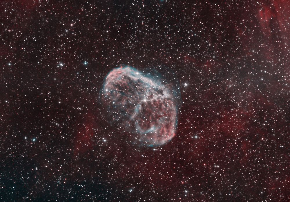 The Crescent Nebula NGC 6888 was formed by the stellar winds from the Wolf–Rayet star WR 136 about 400,000 years ago. The luminosity of WR 136 is approximately 250,000 times that of the Sun, and its age is estimated at 4.5 million years. It is expected that WR 136 will explode as a supernova within the next few million years. Captured on May 7–9, 2022.