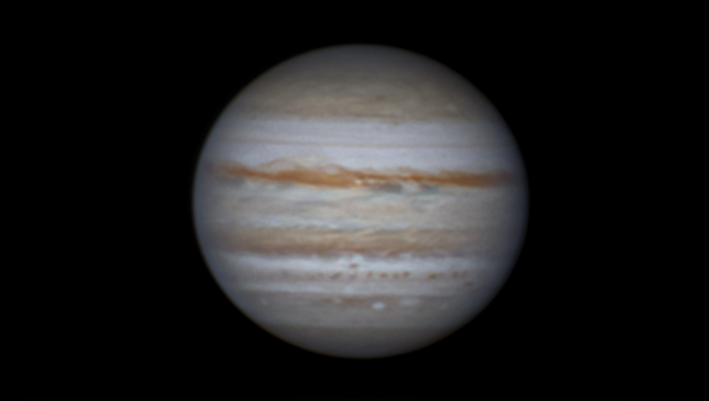 Stacked 2000 out of 10000 frames. Drizzle 3.0X. Altitude 31 degrees. Interesting spot-like clouds on Jupiter.