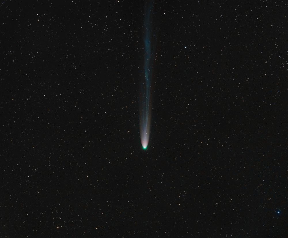 A combination of two stacks – one aligned on the comet (without stars) and one aligned on the stars.