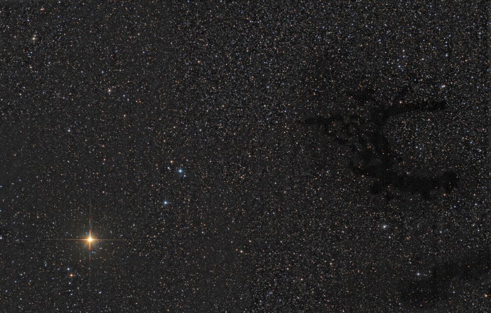 A section of the Milky Way in the constellation Aquila. In the lower left of the photo is the bright orange giant Tarazed (or Gamma Aquilae), and on the right side is the dark gas and dust nebula Barnard 142/143, which also has the nickname "The Letter E Nebula."