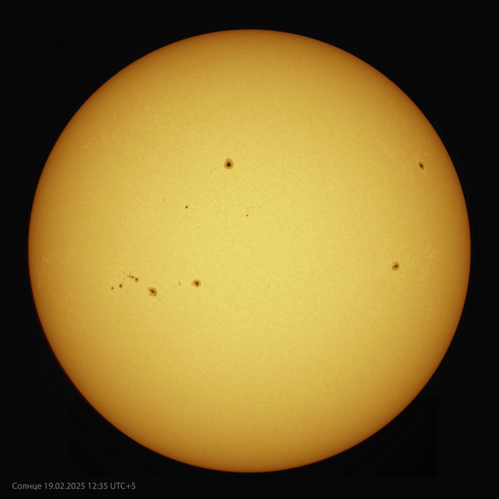 Sun 19.02.2025 12:31-12:36 UTC+5. Altitude 23°11'. Loggia 4th floor. Celestron Advanced GT, Svbony SV503 102ED, Svbony SV305M Pro (exp=3ms, Gain=210), film filter, Player One Photosphere 7.5 nm, SharpCap, AvtoStakkert 150/3000k, Photoshop - mosaic of 6 shots, unfortunately 4 are slightly missing).