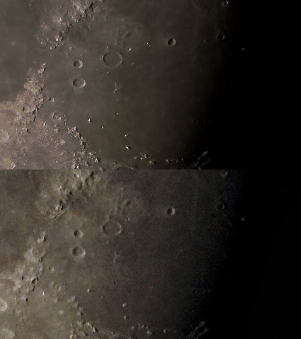 A clear example of the benefit of digital zoom on the P1000: Top - a frame from video at 3000mm focal length, with 4x zoom, Bottom - a fragment of a simple frame from video at 3000mm focal length, without zoom (heavy post-processing in an attempt to bring out details) - It's just a matter of a successful frame from the video sequence, selective post-processing, and excessive sampling, yet it looks as if shot with different cameras.