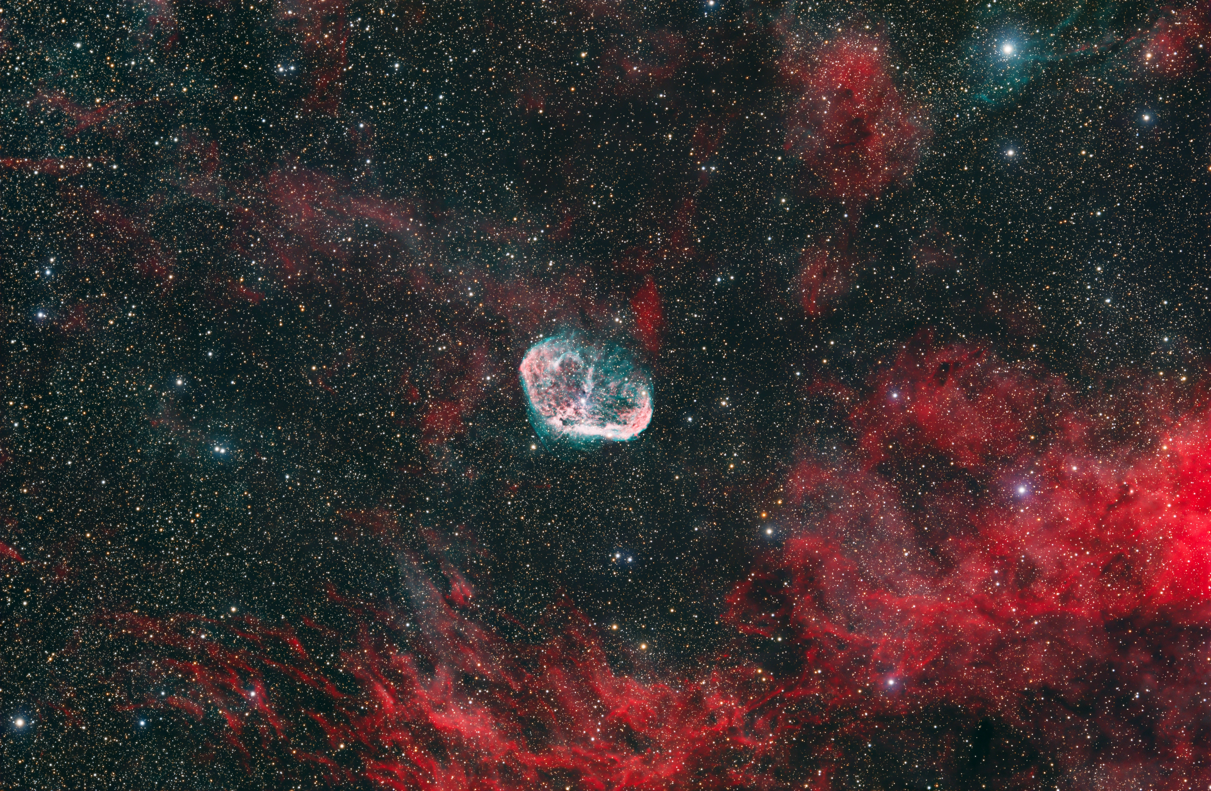 The Crescent Nebula, also known as the Brain Nebula or commonly as NGC 6888 in the constellation CYGNUS. Surprisingly, the result is actually decent. This is what happens when you use proper scripts for blending narrowband channels with RGB, instead of inventing various formulas in PixelMath that produce eye-searing results.