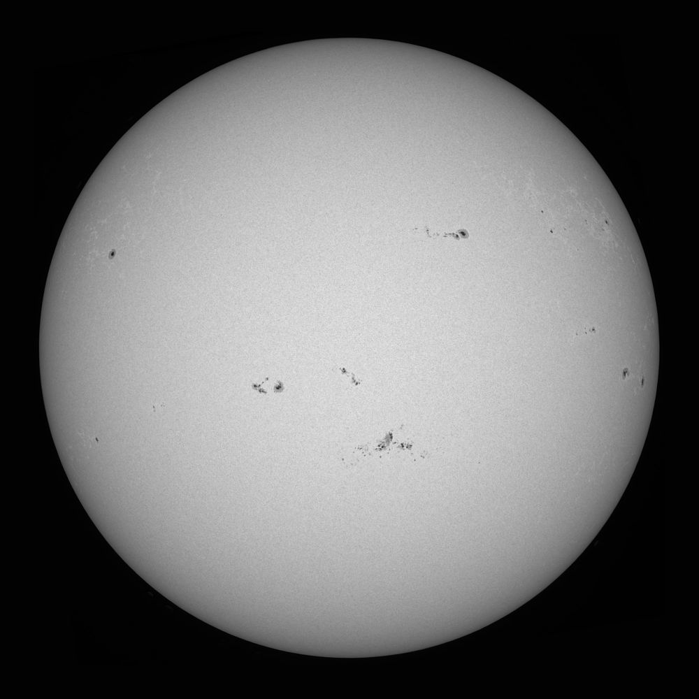Sun 04.06.2024 10:32 (GMT +5). Chelyabinsk, 4th floor balcony. Celestron Advanced GT, Svbony SV503 80ED, SV305M Pro, film filter, Player One Photosphere 7.5 nm. Exp=5ms, Gain=150. SharpCap, AutoStakkert - 15/1000 frames, Photoshop (2-frame mosaic).