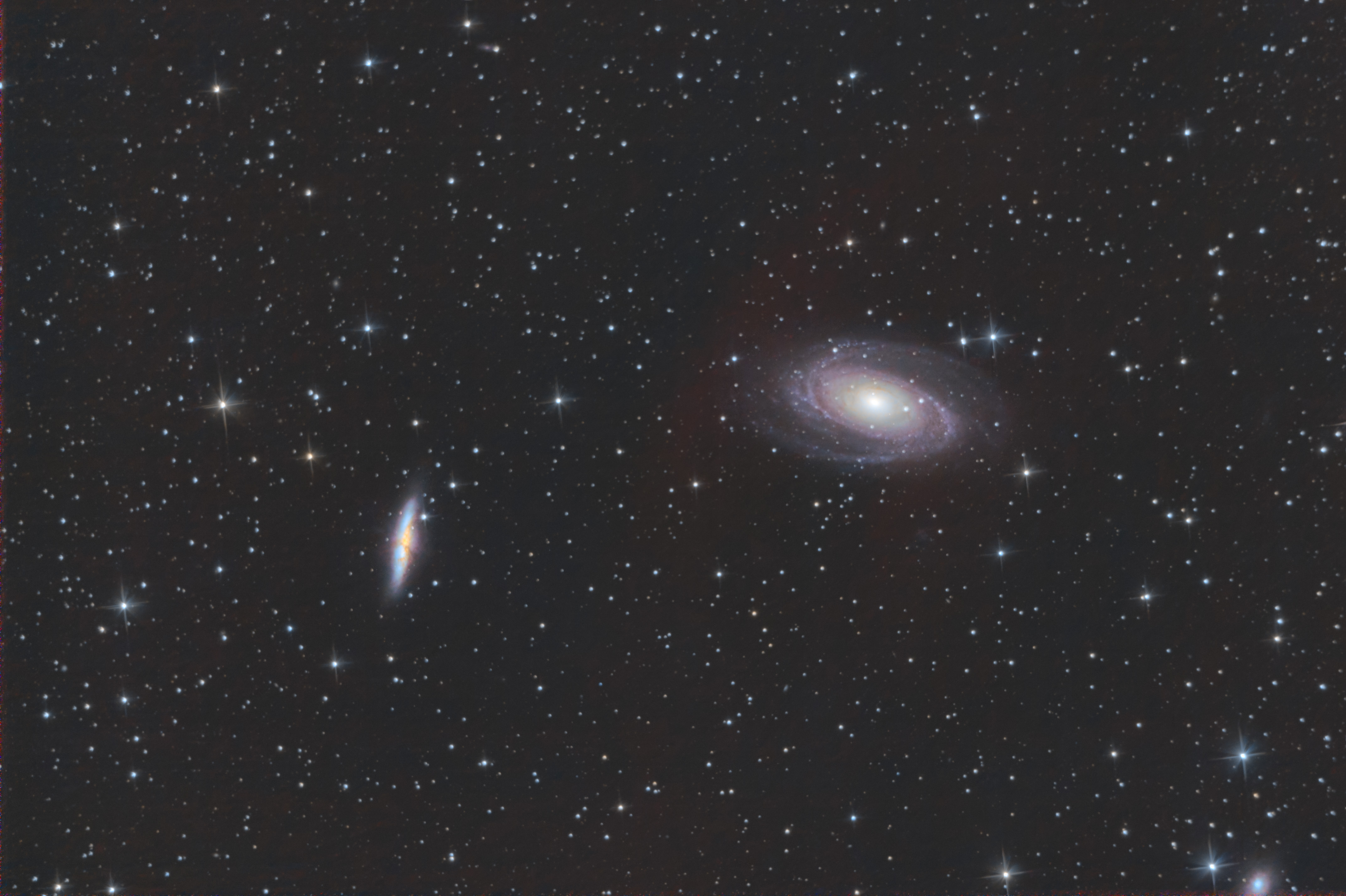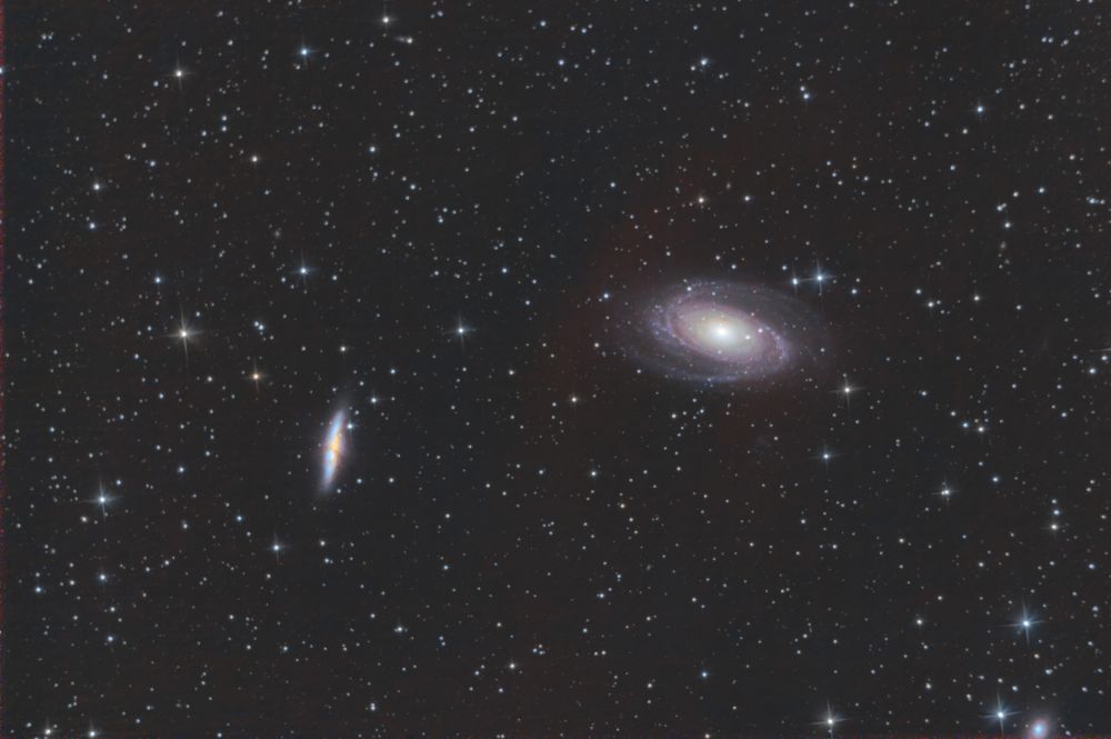 Bode's Galaxy is a spiral galaxy in the constellation Ursa Major. The galaxy's structure features two spiral arms containing a lot of dust, indicating numerous regions of active star formation. Cigar Galaxy is a barred spiral galaxy with intense star formation in the constellation Ursa Major. The galaxy's core contains a supermassive black hole with a mass of 30 million solar masses. The Cigar Galaxy is tilted 80 degrees toward Earth, making it quite elongated, which is how it got its name.