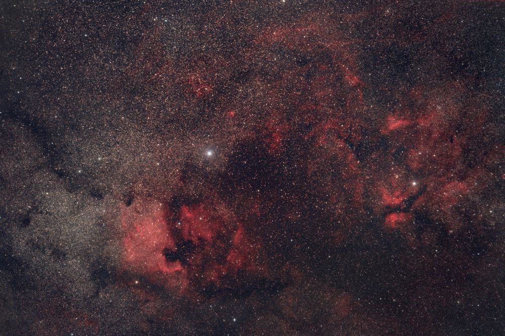 NGC 7000 AND ITS SURROUNDINGS. Telescope/Lens: Samyang 135 mm. f/2 ED Camera: Canon 5DaMark lll Mount: Sky-Watcher AZ-GTI Novosibirsk, Russia Light Pollution: Blue zone Exposure: 40 x 30" ISO/Gain: 2000 Original size: https://deepskyhosting.com/sml1Itn Author: Polyakov Aleksey
