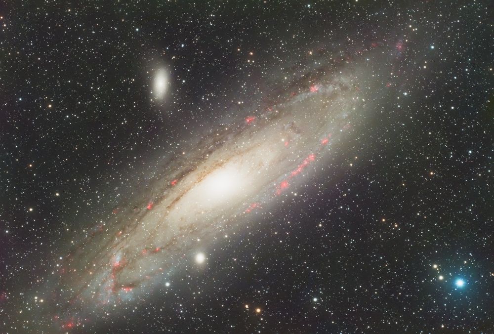 Removed excess hydrogen from the galaxy disk using the ContinuumSubtraction script from the Toolbox package. Added Ha to RGB using the CombineHaWithRGB script from the same package. Enhanced local contrast and detail in Darktable.