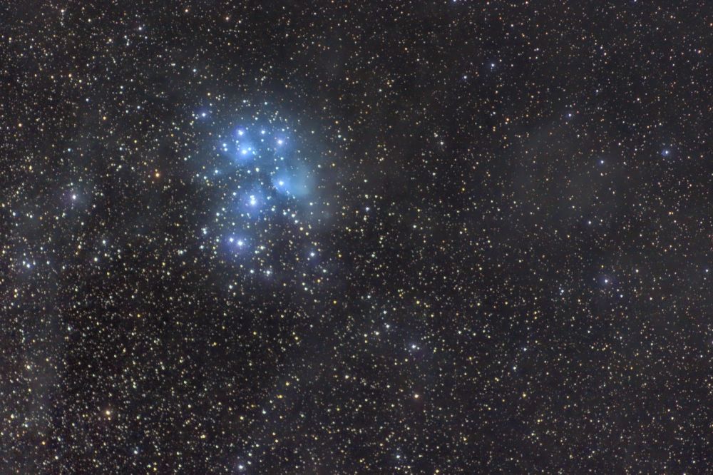 THE PLEIADES OPEN CLUSTER Telescope/Lens: МС Юпитер 37А Camera: Canon EOS550Da Mount: SkyWatcher Star adventurer Software: DeepSkyStacker, Fitstacker, Fitswork, Photoshop Nijniy Arhyz Astroferma Astroverty, Russia Light Pollution: Gray zone Exposure: 39 x 120" ISO/Gain: 1600 Original size: https://deepskyhosting.com/totMywA Author: Strannick