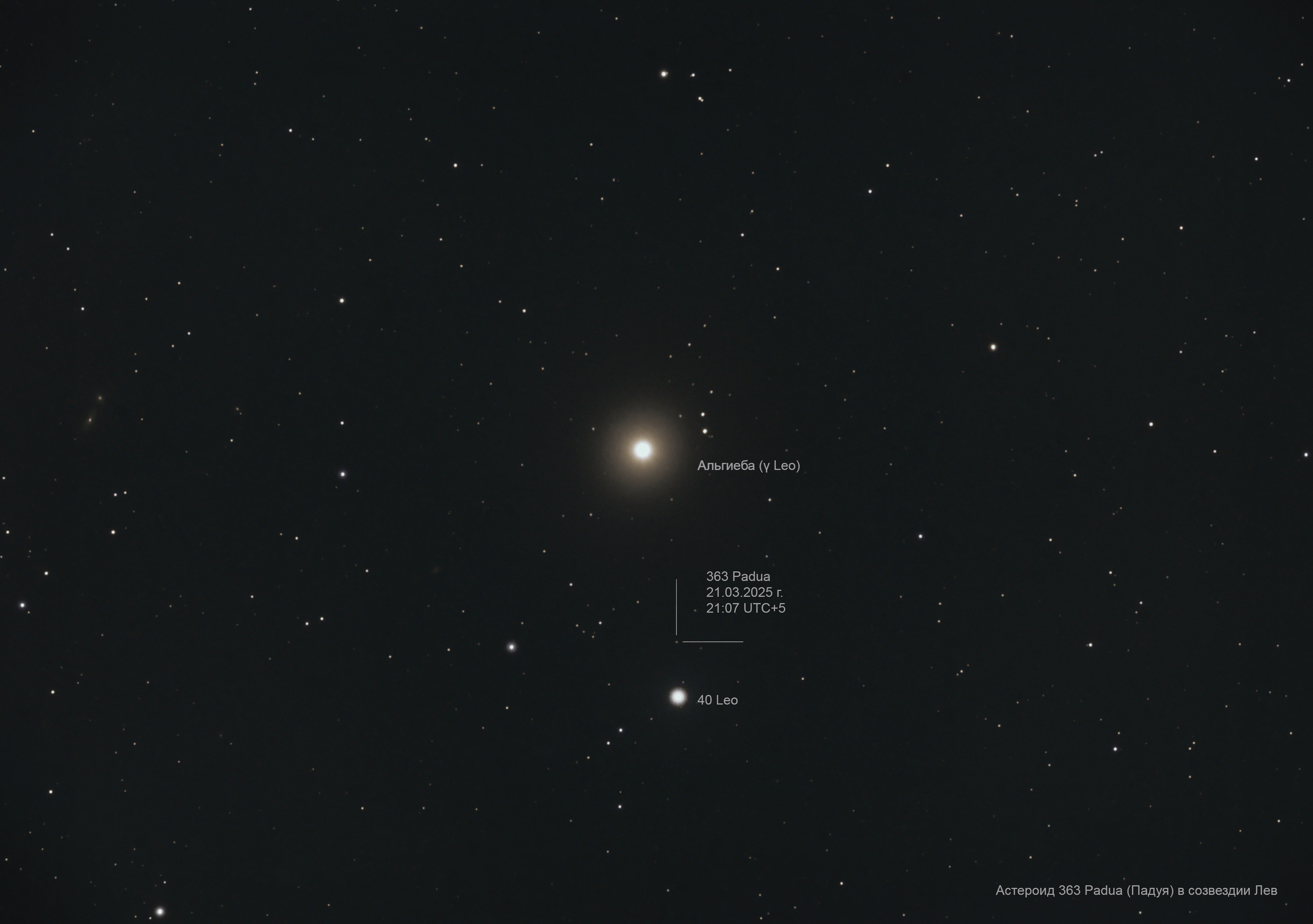 Journey of asteroid 363 Padua through the constellation Leo over three days.