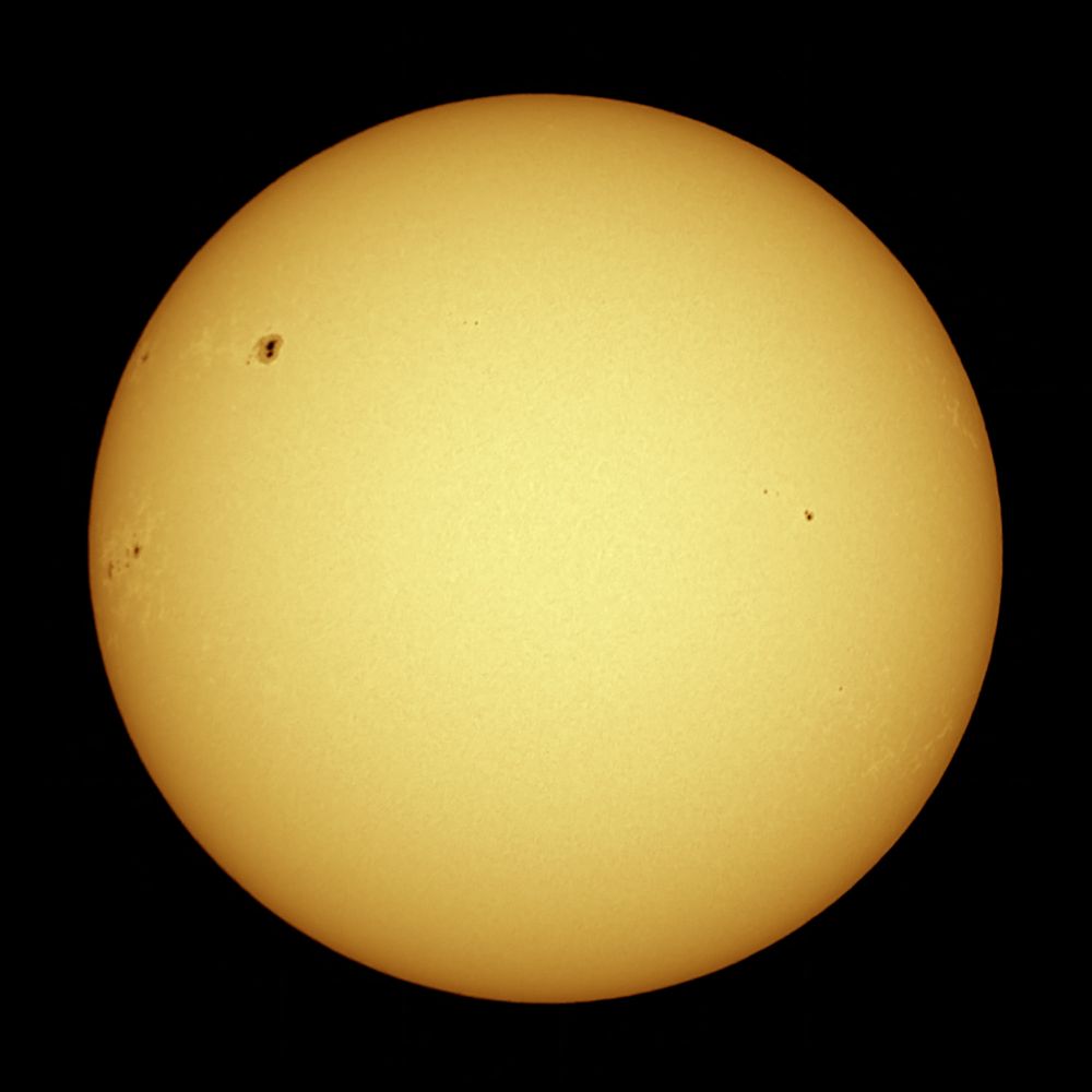 Sun January 15, 2025 at 11:08 UTC+5. Altitude above the horizon 9°45', haze. Svbony SV225 (AZ), Svbony SV503 102ED, film filter, Nikon D5100 - 1/320 sec, ISO 100. AutoStakkert - 10 out of 30 k, Photoshop.