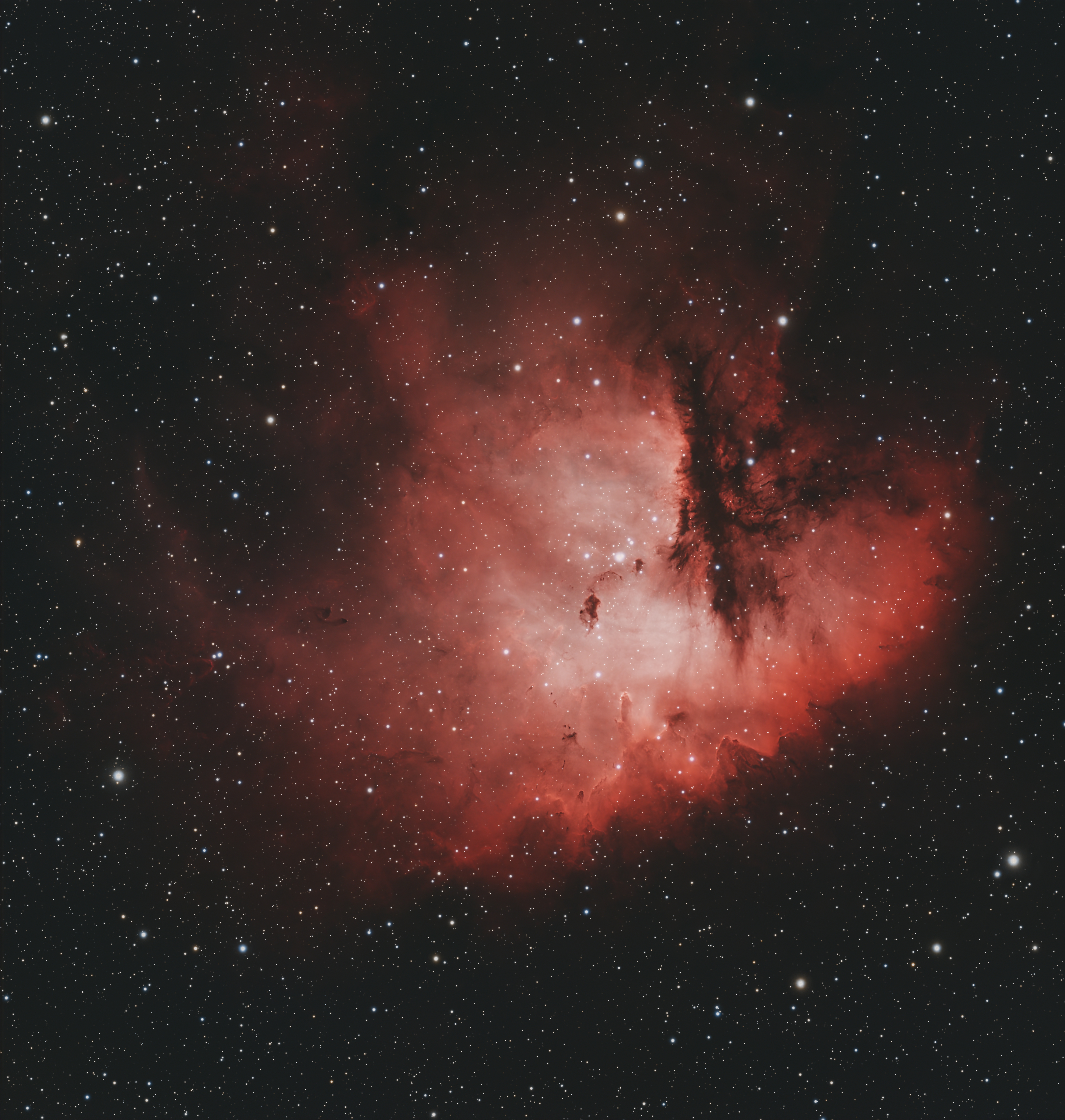 NGC281 PACMAN Telescope/Lens: Askar 103 Apo Camera: ZWO ASI533MC Pro Mount: HEQ5 Pro Guide Scope: Askar 32 Guide Camera: ZWO ASI120MM mini Software: Pixinsight Pavlovskiy Posad, Russia Light Pollution: Orange zone Exposure: 625 x 120" ISO/Gain: 100 - Antlia ALP-T 3nm HaOiii 149 x 30" ISO/Gain: 100 - Optolong L-Quad Original size: https://deepskyhosting.com/wHXKdq4 Author: Lzaza