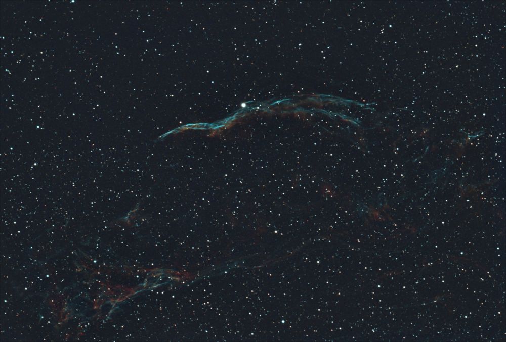 NGC 6960 Witch's Broom and NGC 6979 emission nebulae in the Cygnus Loop. Night of August 2 to 3, 2024. 4th-floor loggia. Light pollution - Bortle 8. Celestron Advanced GT, Svbony SV503 80ED, SV193 0.8x, SV220 7nm Ha OIII, SV405CC. Acquisition: SharpCap - 15x180s. Guiding: SV106 60/240 mm, SV305M Pro - PHD2. DeepSkyStacker, FitsWork, Photoshop.