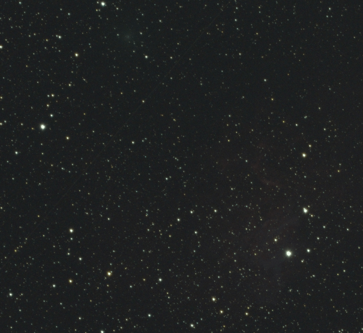 A COMET ACCIDENTALLY CAPTURED IN THE FRAME NEAR IC 405, NOT YET IDENTIFIED. Telescope/Lens: Ascar FRA 300 pro 60 f5 Camera: ZWO ASI294MC Pro Mount: iOptron GEM45 Guide Scope: 50/184 Guide Camera: zwo asi 120 mm Software: DSS, FITStacker14c, Fitswork4, PS, PIPP Krasnoyarsk, Russia Motion over an hour. Not noticed during shooting, appeared during processing. A byproduct, so to speak. Original size: https://deepskyhosting.com/xGi1OnZ Author: Evgeniy Osharov