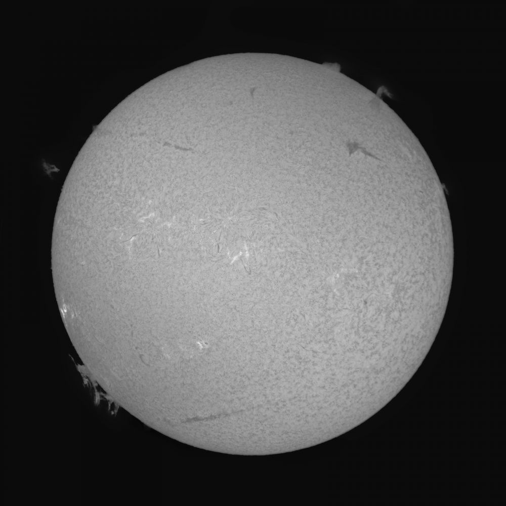 Sun (chromosphere in Hα) - 10:32 UTC+05 August 18, 2025 - Svbony SV225 (AZ), Lunt 40 mm (LS40THa/B500), Svbony SV305M Pro. SharpCap, AutoStakkert 100/500k, Photoshop. Monochrome.